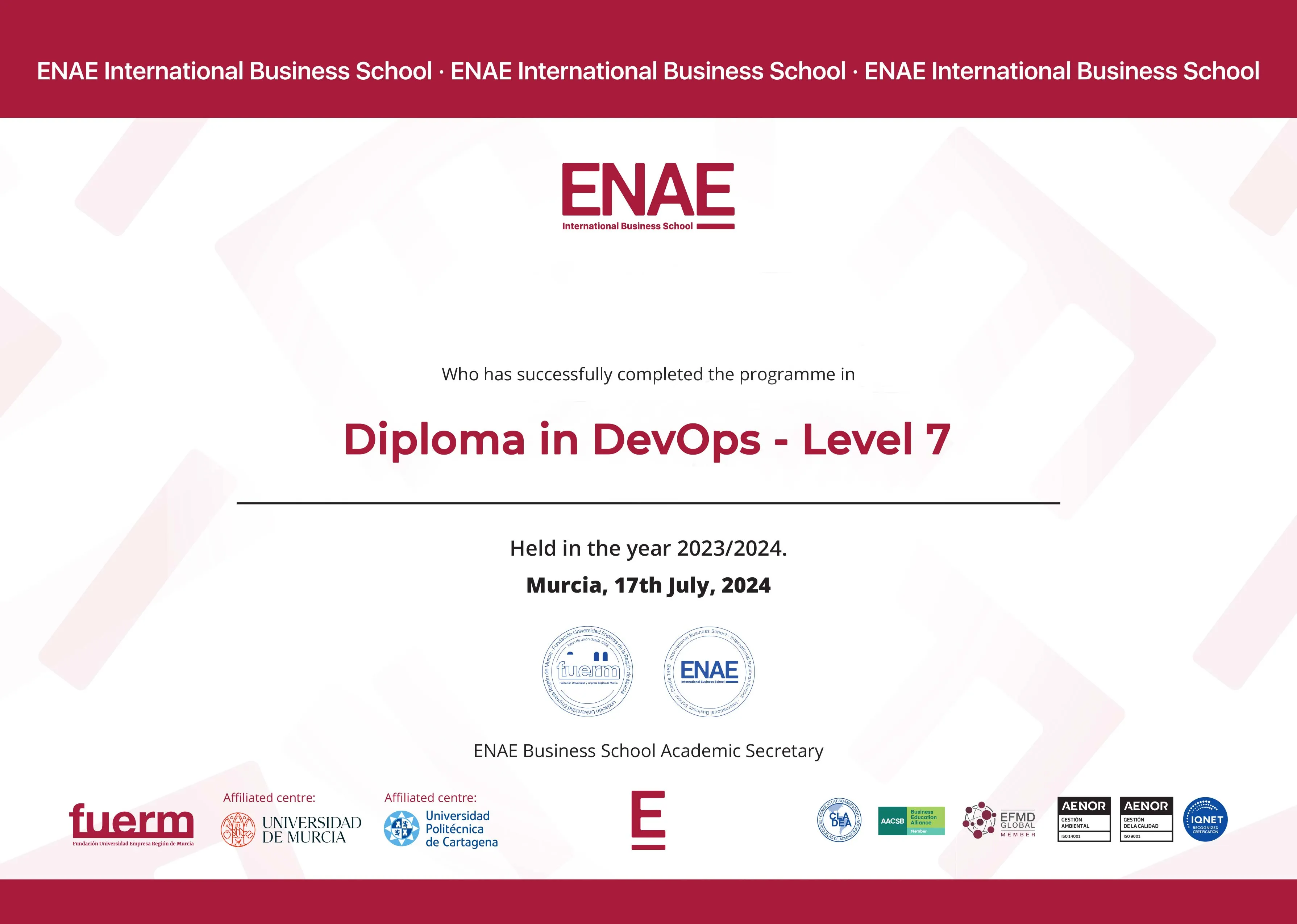 ENAE Business School is a private, for-profit teaching university in Spain. It offers a variety of undergraduate and postgraduate programs with both blended and online distance learning delivery options. Its head office is in Murcia, Spain and is ranked #35 in QS International Trade Ranking - Masters and MBA 2024. SNATIKA learners are awarded MBA, MSc, MA, BSc, and BA degrees from ENAE Business School.
