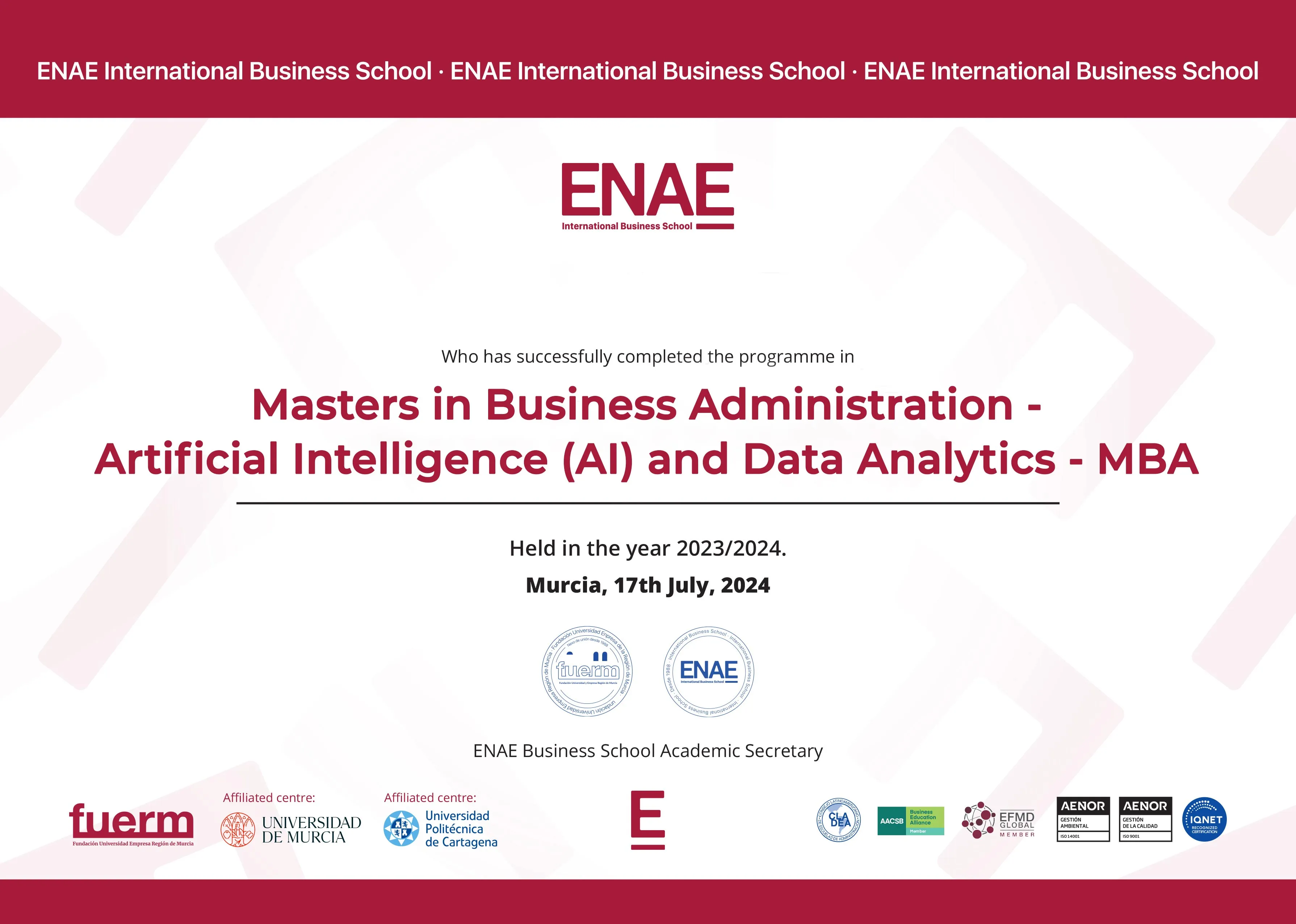 ENAE Business School is a private, for-profit teaching university in Spain. It offers a variety of undergraduate and postgraduate programs with both blended and online distance learning delivery options. Its head office is in Murcia, Spain and is ranked #35 in QS International Trade Ranking - Masters and MBA 2024. SNATIKA learners are awarded MBA, MSc, MA, BSc, and BA degrees from ENAE Business School.